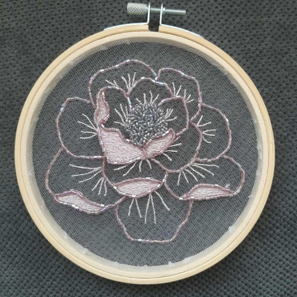Ce kit vous permet de broder cette superbe fleur sur tulle proposée par Atelier Lua en soie d'Alger Au Ver à Soie et perles en version olilas.