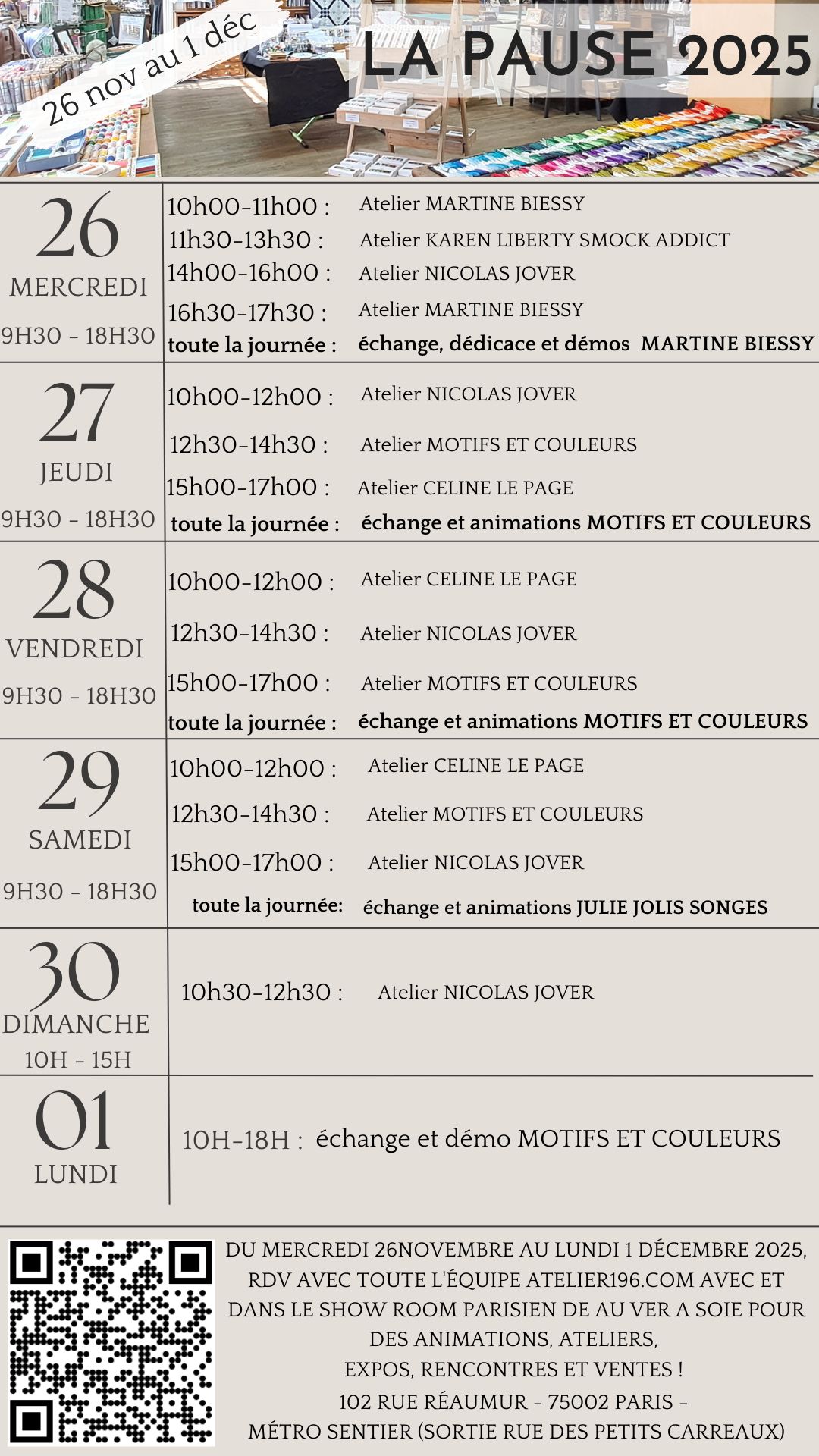 ENTREE LIBRE ET GRATUITE Pour être tenu au courant spécifiquement, régulièrement et en avant-première des évènements de LA PAUSE 2025, cliquez ci-dessous ! (Vos coordonnées seront effacées après l'évènement :-) Lieu : show room de AU VER A SOIE exceptionnellement ouvert aux grand public -