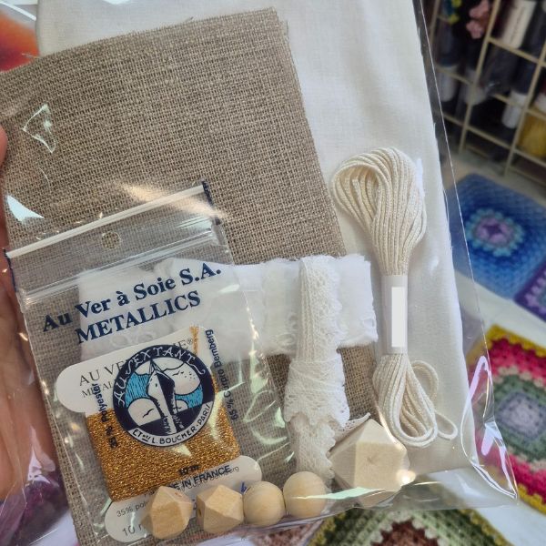 Retrouvez ici un lot exclusif avec un coupon de coton blanc, un morceau de jute souple, 5m de soie d'Alger blanche, un métallisé or, une coupe de dentelle fine, une coupe de broderie anglaise et des perles diverses en bois !